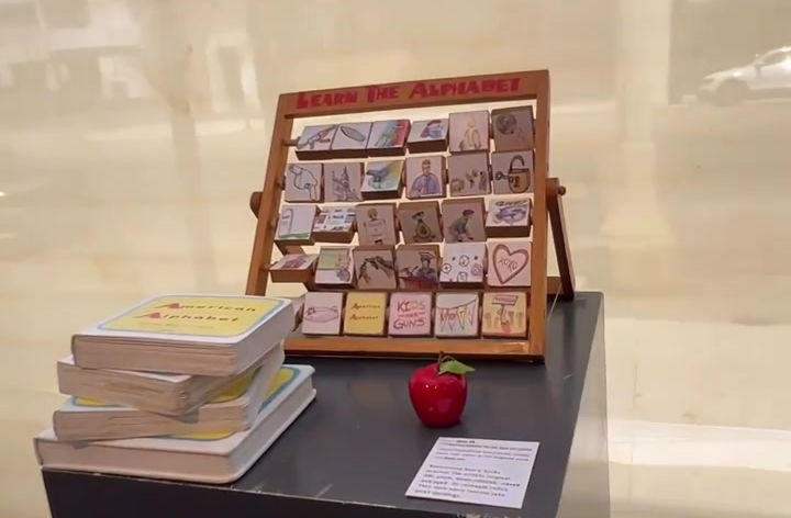 The American Alphabet poem reads: “A, begins Assault Rifle, a weapon of war. B, is for Bullet, that shoots through a door.” The chalkboard no longer teaches math but instead displays children’s unspoken fears. A patriotic desk precariously balances a tower of blocks, mirroring a fragile and failing system.