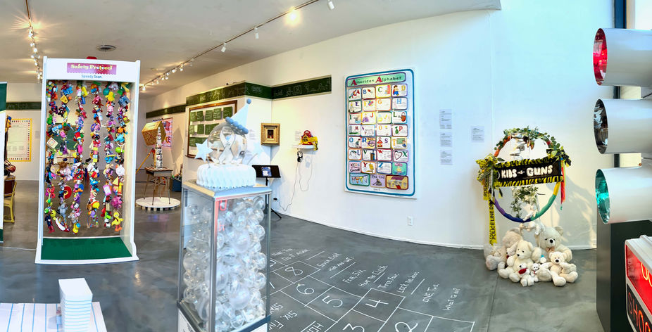 Artist Gina M's The New Normal: Summer School, is an immersive installation confronting America’s desensitization to gun violence. Transforming the gallery into a surreal classroom,